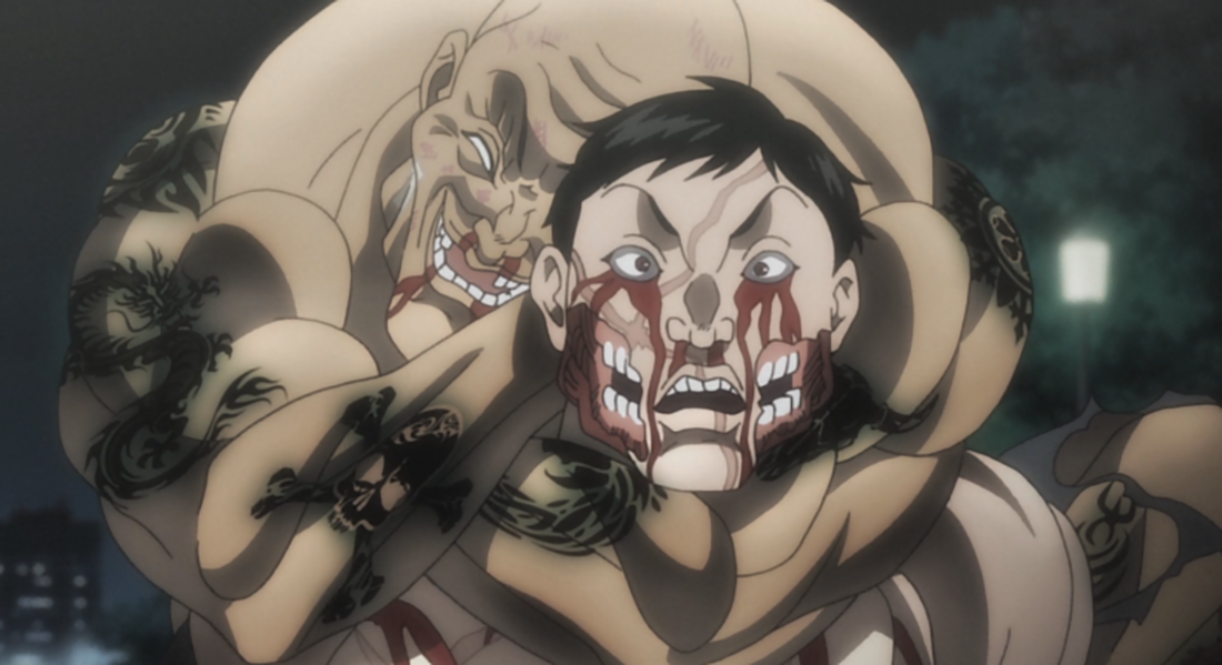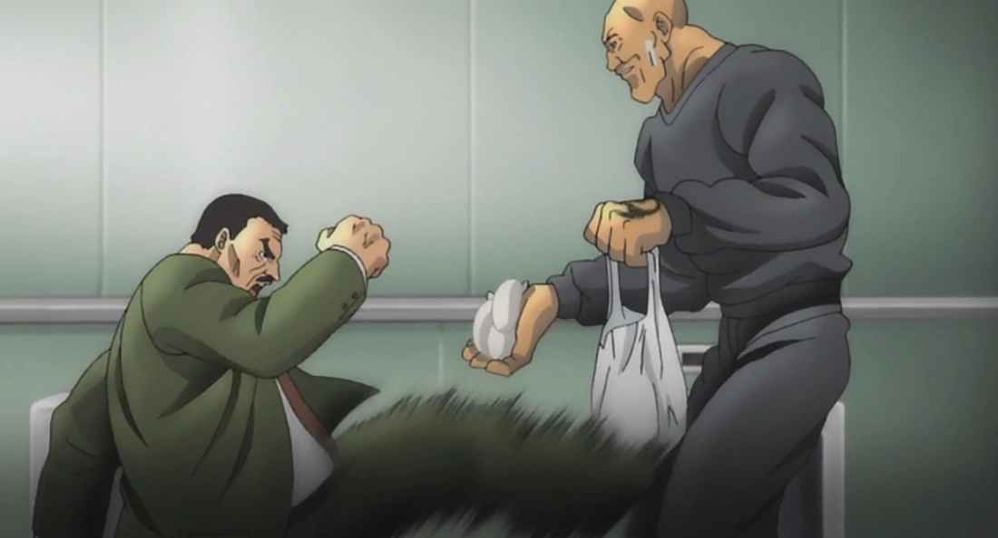 Hanayama takes Spec back to the Metropolitan Police Detention Center, where he is shown gratitude by the Police Captain by bandaging his wounds and treating him with VIP status. While Hanayama is being given a ride by one of the police officers, Spec murders all the officers in the lobby and rushes towards the vehicle Hanayama is in, and flips the car over. Spec then brutally assaults Hanayama with a police baton, and then shoots him both knees with a pistol. Spec attempts to kill Hanayama by shooting him in the mouth but Hanayama quickly turns his face so the bullet harmlessly passes through his cheek. Hanayama then brutally tackles Spec to the ground and begins to punch Spec repeatedly in the face. After a gruesome fight, Hanayama defeats Spec by using his Vice Grip to crush his throat/windpipe/carotid artery.