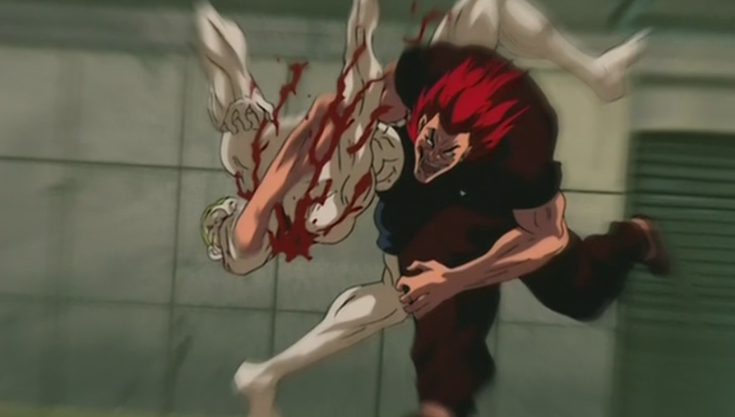 The anime shows another retrospective from the time when young Yuujirou fought on the battlefields. America still tries to get rid of Yuujirou and sends all its best units against him (the Green Berets, the SEAL, and the Delta Forces). However, the young fighter defeats all of them. Ultimately, the Americans turn to Biscuit Oliva, who is a powerful man and a vip convict in the Arizona prison. Oliva is hired to get rid of Yuujirou under the pretext of eliminating some drug cartel dealer. Oliva introduces himself to Yuujirou when they meet, and the young fighter lets him know that he knows who Oliva is. The prisoner is happy with this fact and starts a short fight with him, but after a while Yuujirou runs away, saying that he prefers to leave Oliva for another time. At the end, America decides to form an alliance with Yuujirou. In other words, USA is completely defeated by one man, Yuujirou Hanma.